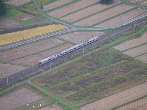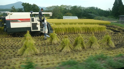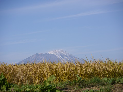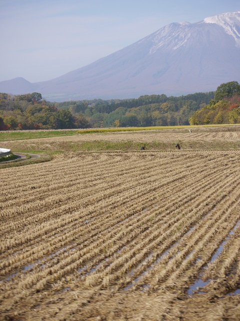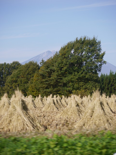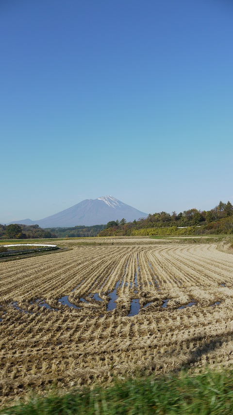 車中から瞬間撮影した稲刈りを終えた田圃と岩手山です。