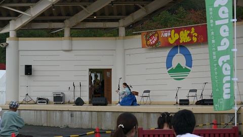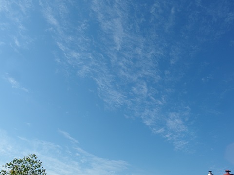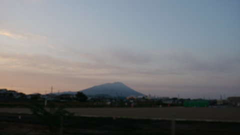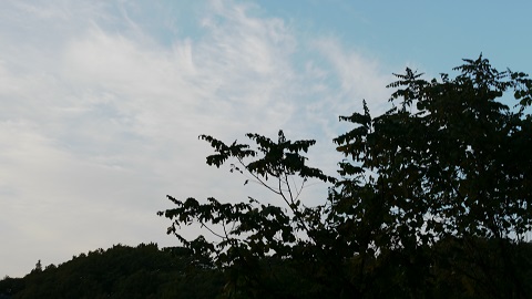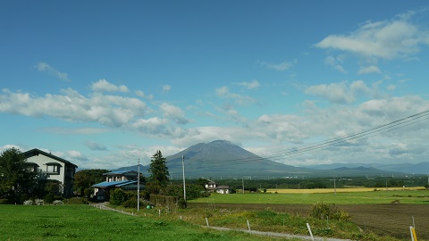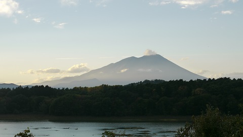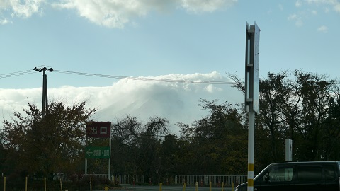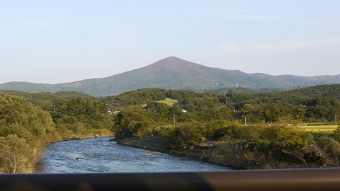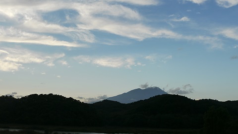 好摩に着いて地面に足を付いて写した姫神山です。櫓上の雲間の青空に心の余韻が残りました
