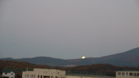 昨日は通勤時でしたが、今度は帰宅時です。綺麗な月が東の姫神山の裾野から顔を出し初めて、西の岩手山方向は綺麗な夕焼けでした。夕刻の帰り道だと思われる小学生が空を見上げながら歩いているのを見かけて、自分の小学生時代を思い出してしまいました。茜色の空に飛ぶ赤とんぼの群れを見て感じる切なさをもう一度味わいたいものです。季節を感じて心嬉しかったあの頃は良い時でした。今の子供たちにも、ゲーム機を横に置いて、外の自然の風を感じて欲しいものです。日本はこうした季節感のある素晴らしい国なのだからねと教えてあげたくなります。