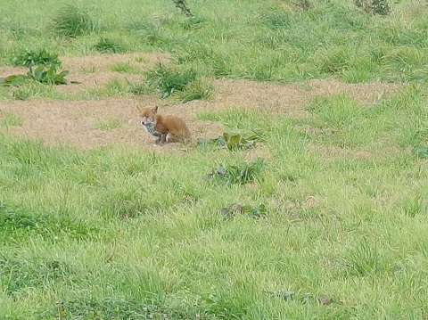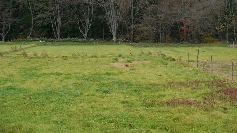 あの日雫石で見かけた狐はどうしているのでしょうか。寒くなる前に脂肪を蓄え、もふもふの毛をはやして丸くなっているでしょうか。最初は犬でも放し飼いにされているのかなと思いましたが、よく見るとしっぽと脚がすらっと長い狐でした。こちらに気づいて歩みを止め、すっと座りこみました。少し警戒しながら、じっとしてよそ者がいなくなるのを待っているようでした。近くにいる牛もいたのですが、そちらは気にもせず共存しているようです。(栗城)