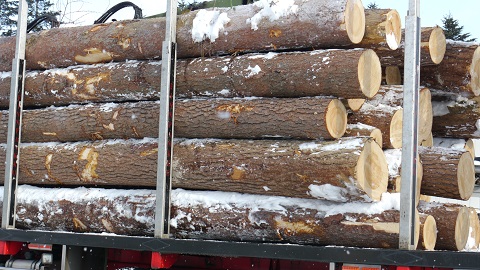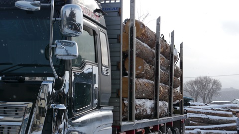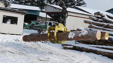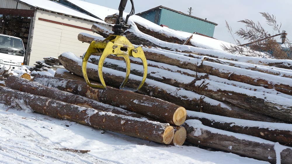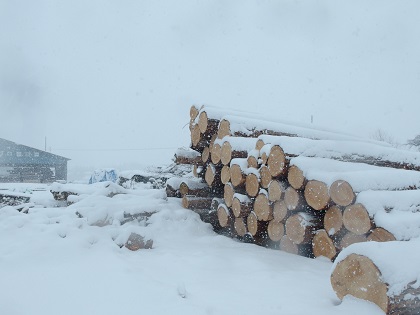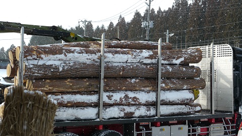 白銀の世界に赤松の丸太がどーんと積んである光景は迫力がすごいです。