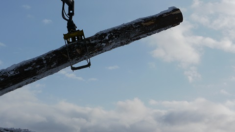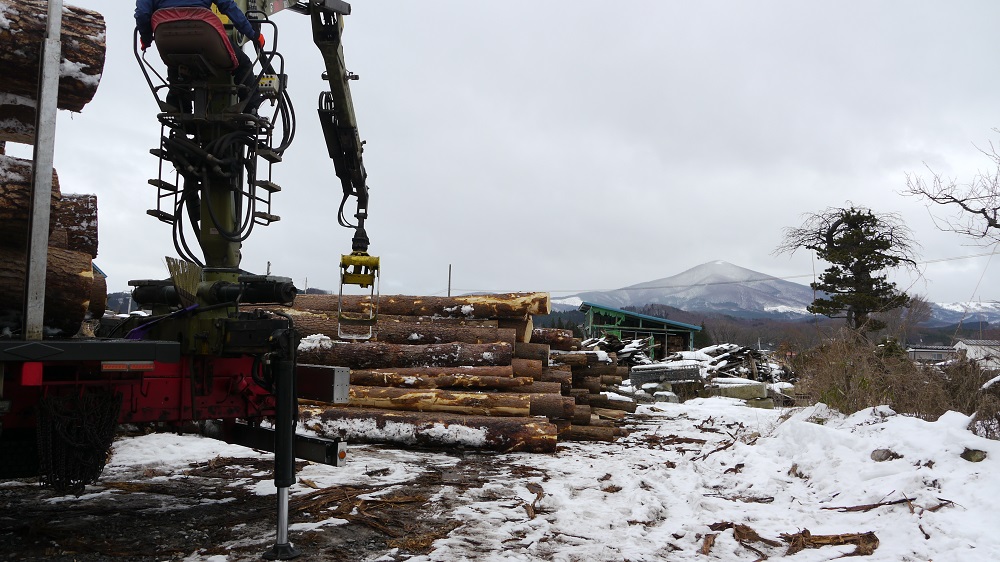 この前山で見た赤松が今朝、到着しました。こうして、まるで人が掴む様な動きで丸太を掴んで降ろすんです。見ていて、凄いなーこれ欲しいなーぁと呟いてしまいます。昨日の写真と同じところに積みましたが、新たに届いた赤松が6mです。前からの丸太が8mで、その長さが良くわかります。春には製材して、乾かし、大切に使わせていただきたいと思います。