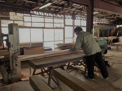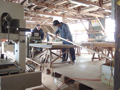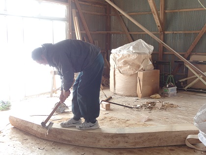 加工が進められています。ナラの木に、まさかりを振るう場面は