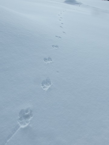 好摩の誰も踏みしめていない雪の中に足跡がありました。猫のタイガの足跡にしては大きく、狐か何かだろうか。ここ数日もしくは、昨晩ここを通ったのでしょう。サラサラとした雪にはっきりと模られています。前足と後ろ足がちょうど重なるように歩く動物ですが、どちらかの足が大きいようでした。