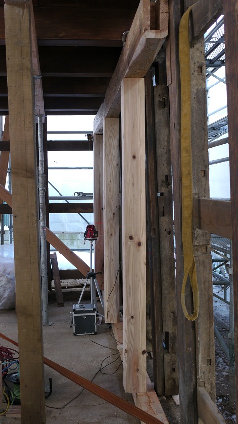 ↑車知栓継ぎを外して10㎝倒れた大黒柱の歪みを直して、元通りに確りと楔を入れ込んで頑丈に固め直しました。↓