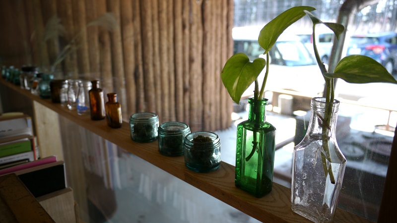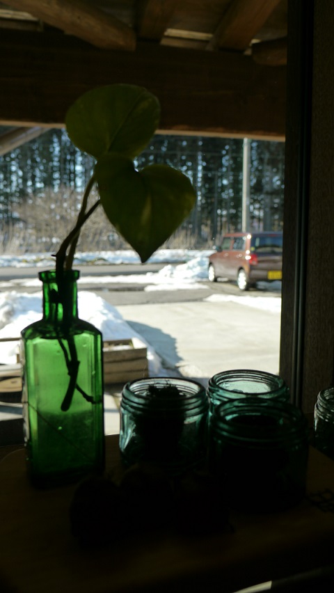 好摩の事務所脇の私の仕事場の大きなガラス窓のところに、ガラス瓶を並べてみました。外の光で綺麗に輝きます。これらは解体現場で拾ったものです。ゴミと思うかどうかは人次第です。でも、泥だらけだったので、何度も良く洗ってこの姿です。手を掛けるかどうかは、後のイメージが持てるかどうかですね。