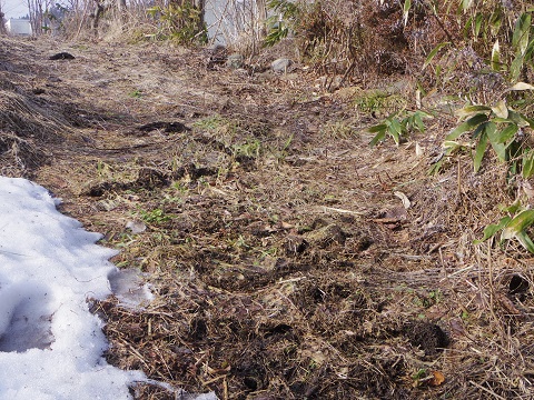 さて、好摩のには残雪も今日で一気にと溶けるでしょうか。地が雪解けであらわになった部分に目を向けると、いくつかの穴とそれを繋ぐように土の掘り進めたような跡がありました。モグラがせっせと歩いたのでしょう。春がすぐそばにあることを感じます。(栗城)