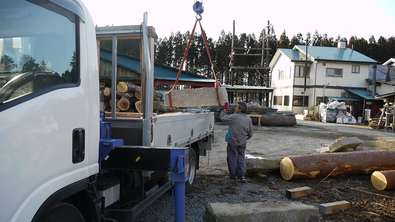 特殊伐採を生業の一つとしているフリーランスの森君からの依頼で、ユニック車を貸したのですが、サイカチや胡桃に山梨と思われる丸太が届けられました。サワラの様なヒノキの様な水に強い針葉樹も有って、こんな一握りの人間同士の小さな繋がりで、これらの樹木が無造作に粉々にされずに、製材されて板となり、新たなが命が吹き込まれるのです。製材機が手元に在る者としての使命感の様なものさえ感じてしまいます。