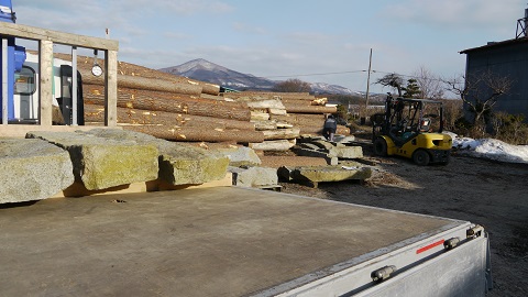 それを見て、内に秘めた暗黙の思いもくみ取り図面に寸法を記入して、この石一つ一つのサイズを測り、並べる順番を考えながら積み込んでくれているのがこの写真です。まさに一心同体と私が感じて感謝した瞬間の写真なのです。なんせ、岩泉中学佼を共に卒業した悪仲間であります。先生に殴られた思い出も一緒です・・・笑