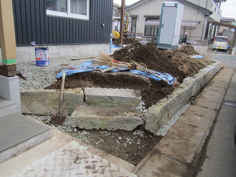 月が丘の新築工事では敷地の周囲にこの石を並べて木を植える植栽工事を提案させていただきましたので、私の発案創作の庭造りとなります。昨日も書きましたが、昔はこうした段取り仕事は私自身が自分でおこなっていたものです。でも半身麻痺となってしまった現在は、頭で考えたことを、簡単なスケッチにしてはたらいてくれる皆に渡して、代わりに体を動かしてもらうしかないのです。スケッチ図には、作業方法や人員に作業手順、そしてなんらかの配管があるとか道路養生などの注意事項までも書き込んで、頭に浮かんだ事柄全てを表現して伝えています。