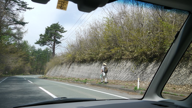その道中には、こんな人にも出会います。ご夫婦で編み笠被りで散歩してましたが、目当ては山菜でしょうか