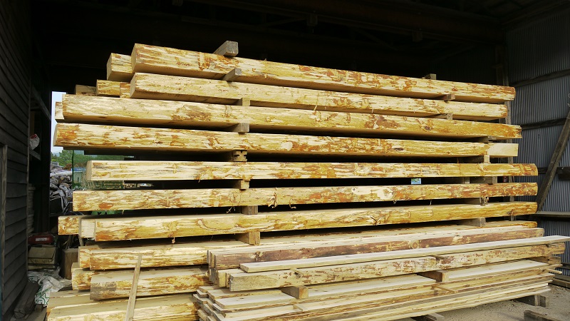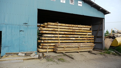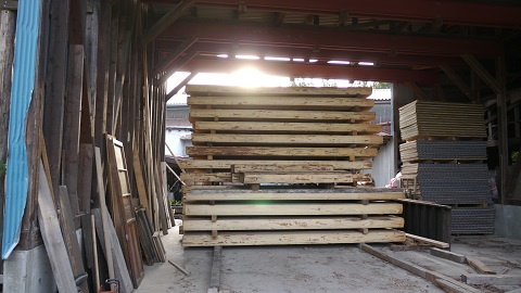 天気の良い日が続きましたが、やはり何時までも良い筈が無く、雨が振り出しましたね。懸念していた赤松の製材後の皮剥きも完了して、場内の屋根の下に桟積み保管する事が出来たので、一安心です。これで雨が上がって良い風が吹くととても良く乾きます。今後2~3年乾かす事になります。これだけの長材のタイコ梁の在庫数は日本国中に誇れるかもしれません。ただ、製材した本体から出て来た板類の置き場が足りなくて気苦労が絶えないのです。こうして日記を書きながら窓外の降りしきる雨を見ながら溜息です・・・でも風情を感じる情緒ある雨ですね・・・笑。