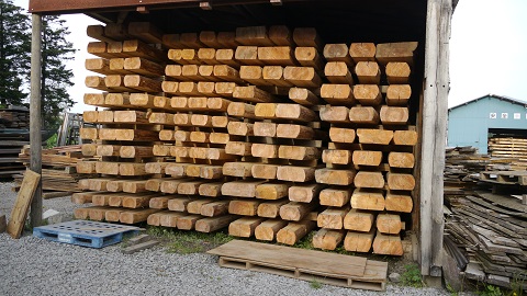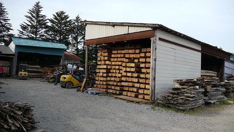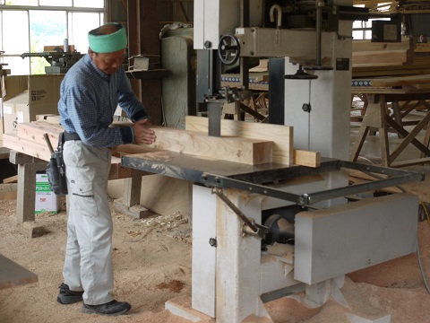 この作業は、一度柱材で長さを切り落とした残りで端材扱いされている部分ですが、帯鋸で挽割って建築現場で必要とされる部分へと向ける為の木割り仕事です。この様に、場内にある木材の全てを無駄にせずに使い切ります。