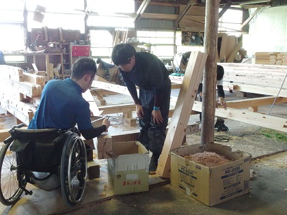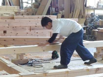 6mの長材を仙北の新築住宅に使うので、出して大きさを確認して修正挽の準備をしています。修正挽とは、2~3年桟積み自然乾燥させると乾きながら反りや捩じれが出てしまいますので、そのままでは大工の墨付けや刻みが困難ですから、再度真っすぐに製材して扱いやすく修正する作業を言います。この時に材料を無駄にすることなく良く見て調べる為に水糸をあてがいながらどういったサイズの梁に出来るかを検討します。また、左右どちらが綺麗で良く見えるかも調べながら番付けを決める作業も含まれます。この段階で上棟時の木組みのイメージを持つことが大切な仕事になります。車椅子に乗りながら手伝いを求めて取り組む大和田の真剣な眼差しに私も心打たれましたが、それでいて、良く考えろと厳しく接してしまいます・・・これらすべてが85年生きた赤松です。とても疎かには出来ません。3m4mは世の中に数あれど、5m6m材ともなると希少価値で本当に無いのです。でも短いのを繋いで使うより1本の長い梁の方が耐震性が良い筈です。自身で図面を書きていた時も、世の中に3m4の梁しかなくて、あと1m長いと届くし強度が増すのにと感じたことが良くありました。若い面々にもそうした事を呟き教えながらこうした仕事をしています。