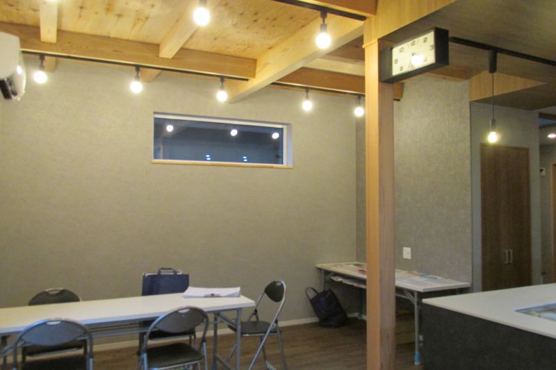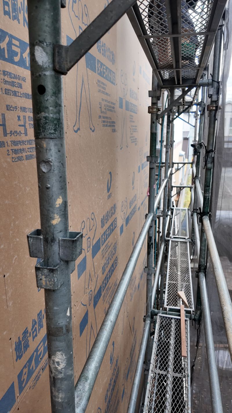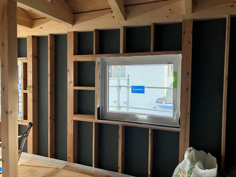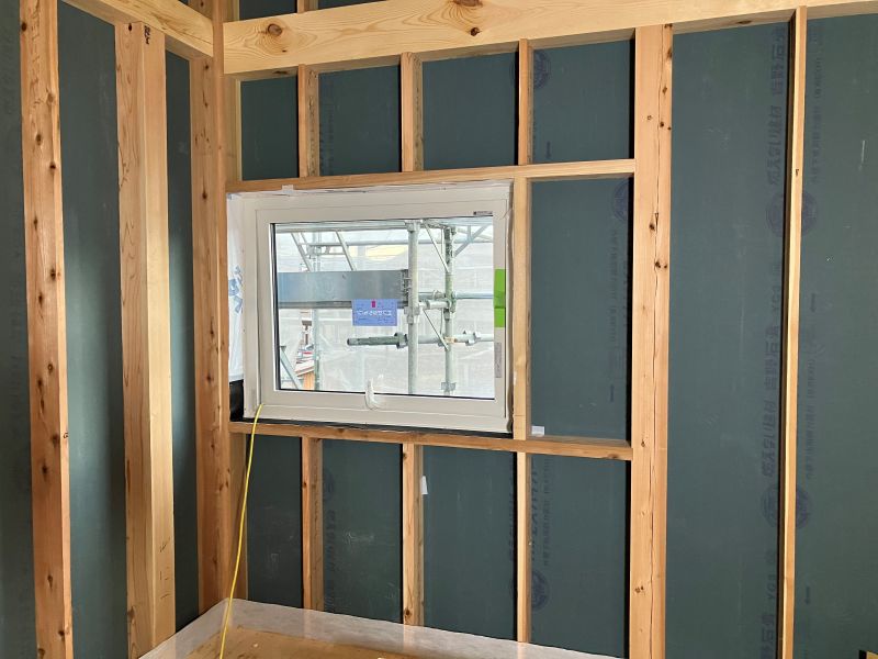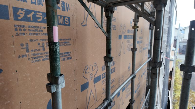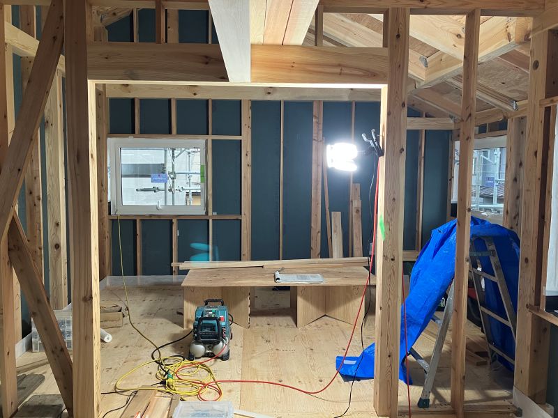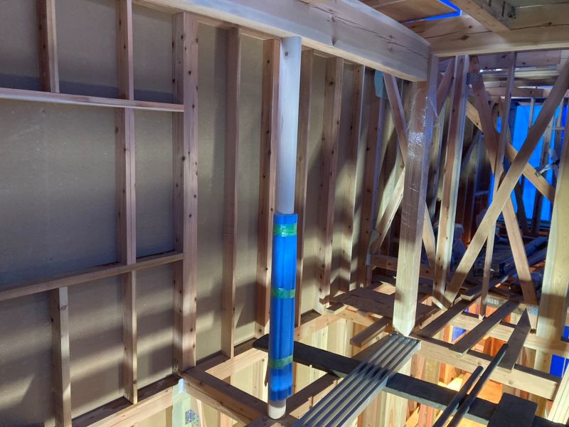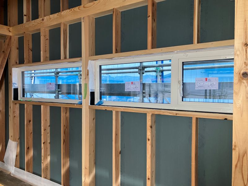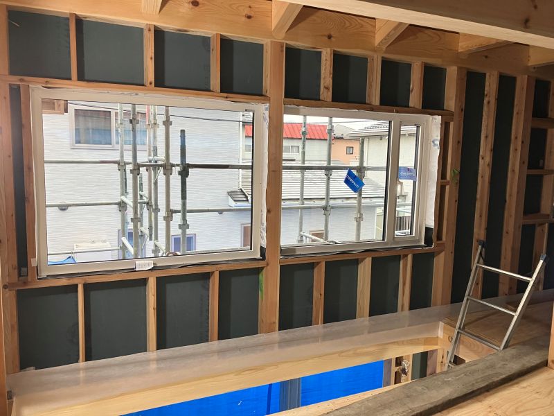城西町の新築現場は屋根断熱工事が行われていました。大屋根の吹き抜け部には、内部足場を組んでの施工です。南側の大開港は木製サッシで、豪華です。