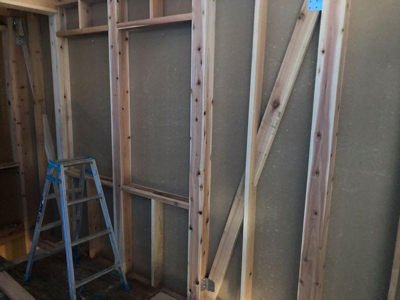 師走上旬に上棟した鉈屋の新築工事は、屋根を葺き上げて筋違いも取り付けて間柱窓台の取り付けも進んでいます。現在の電動工具には、充電器がつきものなので、雪や雨で濡れて困らないように現地に置いた小屋に電線を引き入れて金物置き場の小屋内部で充電しています。小屋を置かせていただいているお隣様に大感謝です。
