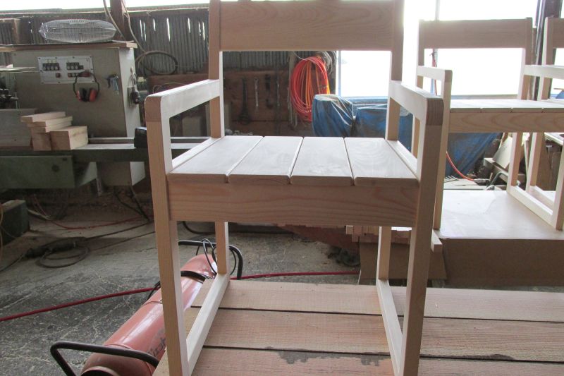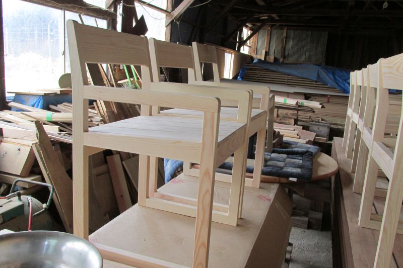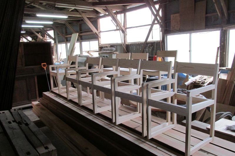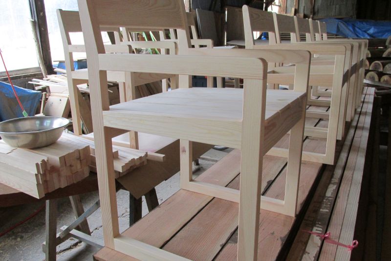 先日来取り組んでいる椅子は座面が取り付けられて大分出来てきました。シンプルで軽く持ちやすい椅子です。使用した樹種は南部赤松ですから、経年変化で飴色につやが出てくる椅子になっていくはずです。床材の端材で作られたので、元から節が無い板だったので、無節です。10台出来ました。これら5台は行き先あるので、残り5台が販売用です。