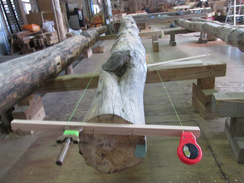 古材の刻みも終盤です。明日から現場に向かう予定でした。そこで刻み場を見に行くと、曲がりの激しい丸太梁に水平に水糸を張って刻みの上がり下がりの正確さを確かめていました。これがこうした材に墨付けしたり刻むコツです。昔から水平墨が曲がり材を扱う大切な妙法であっただろうと思わせる大工の技術です。そして、車椅子に乗って作業する大和田洋平の根性も素晴らしいと思います。