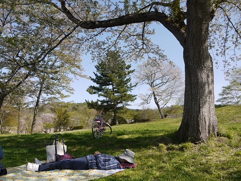 元競馬場跡地も今では素敵な公園に整備されました。ゴールデンウィークはまさにその名の通りゴールデンな天候でとっても気持ち良いですね♪私はこうして、桜の木の木陰で暖かな気分でお昼寝して楽しんでいます。自分で寝たり立ったり出来るまでに回復できているのです♪ここまで歩いてきました。公園では、孫たちがボール遊びや自転車遊びをしていて、そうした風景を見たり写真を写したりと、大型連休を満喫させていただきました。5月3日の事です。昨日4日は、念願の岩洞湖の山歩きもしてきたんですよ♪なんと山羊を連れて行くこともできました。その時の写真は明日使おうと思うので、是非明日も杢創舎日記を見て頂ければ幸いです。現場便りもよろしくお願いします。
