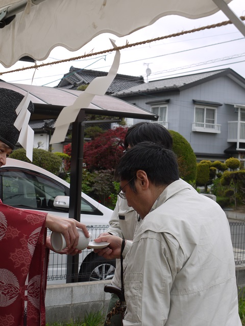 退院後初の地鎮祭に参加できました♪場所は盛岡市月ケ丘になります。写真は地鎮祭の催事が無事豊斎された後での、献杯です。専務の運転で連れてきてもらい参加できたので、普段は口をつけるだけなのですが、確りと呑んでしまいました(笑)山羊散歩の山歩きや高松の池散歩とか、割と自由に動き回っていますが、地鎮祭のこの時はとても嬉しかったです。建設地探しの時から施主様と一緒に足で歩いて探し回った日の事を思い出します。どこの不動産情報にも出ていないこの地を、施主様が歩いて探されましたから、よくぞ、見つけられたものと感心させられた日の事を思い出します。あれから1年が経っていますが、その間間取りの計画を進めているうちに私は救急搬送入院してしまいました。図面は栗城が引き継ぎ、見積もりは佐々木が担当してくれました。病室まで図面や見積書を届けてもらっての打ち合わせをして、おとなしい入院患者ではありませんでした・・・何より、左腕と手が動かないので、右手で何か書こうにも用紙を押さえることが出来なくて、呆然とすること幾度かの有様でありましたそれでも、ご契約を頂き、こうして無事起工式の良き日をお迎えさせていただくことができました。次は地盤改良工事に着手いたしますが、私は構造計画を車椅子大工の大和田と取り組みます。感謝の気持ちが目一杯溢れる気持ちを込め、それを表現できる木組みと、健康に優しい室内空間の創造に努めさせていただきます。新しい仕事の始まりです。初仕事内容が電磁波対策のオールアース住宅となります。地中熱ヒートポンプ輻射暖房も予定されています。インナーガレージ付の至れり尽くせり住宅工事の始まりです。
