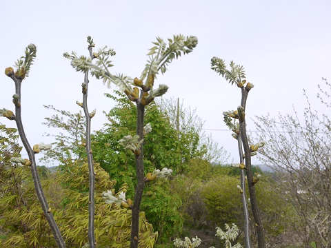 新緑がまぶしい良い季節になりましたね♪好摩の庭でも、色々な樹木の葉っぱが可愛く芽吹いています。写真は槐の木の芽ですが、この他にハリギリが両手を開いたようになっていて、ヤブレガサに間違ってしまいそうでした。季節の変わり目は地球の自転と傾き、加えて太陽を中心とした公転に太陽の重力が関係して、物理的な算式にしてしまうと、なんでも美しい算式になるのだとかやに云われます。難しいことは分からないのですが、四季の国日本でも自然豊かな岩手に住み暮らしているのを毎日この芽吹きを見ては実感しています。写真の槐を見ながら脳裏では、惑星運動の姿を描いているのでだから、変わり者と云われる所以です。