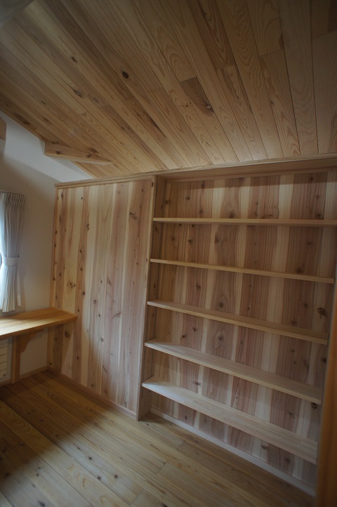 最近は子ども室をOPENの大きな一部屋にして、後で仕切ろうとの間取りのご要望が多く、大半がそうしたご希望になります。今回高松のS様から、新築5年目で、先のお子様のお部屋の仕切りをご依頼いただきました。そこで、杉の板材を使用した本棚を設ける仕切り壁をご提案させていただきました。本棚は2室の双方に出来たので、兄弟差のない同等内容です。本棚の裏板は画びょうをさすのもビスの取り付けも可能です。杉板材の準備加工に4人現地取り付け2人工で、御自宅仕事はお客様のお休みの1日で完了できたので、お煩わせしないで済んで良かったです。ご参考にしていただければ幸いです。