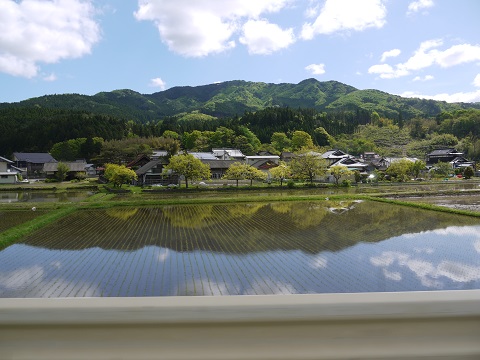 この季節は田圃に水が引かれて、空を写す鏡になるので、美しい風景画を見せてくらているように感じられる瞬間が多くて、カメラを手放せませんね♪この写真は専務が写したものですが、アングル構成は横から口を出している私の意見です。常にこのカメラを手にしてきたからわかる撮影後の風景画の切り取り場面を想像できます。以前は一人で写していましたが、今は夫婦二人で臨みます。良い思い出も一緒に写し込んで翌日こうして日記に使い、振り返る時の記憶の映像に出来そうで嬉しいものです。
