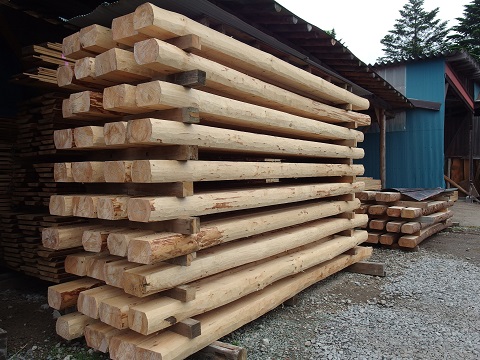 今年入ってきた米内のアカマツも製材が進み、自然乾燥が始まっています。奥の皮がついているアカマツはこれから人の手によって丁寧に剥かれて、手前のように積み重ね乾燥させていきます。十分乾燥させた後、1本ずつ太さや曲がり具合を確認しながら、それぞれの住宅のどの部分に使うのか見定めていきます。杢創舎の1棟1棟の個性になります。(栗城)
