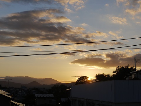 昨日の夕刻の写真です。以前は朝が早くて東の空、姫神山方面の景色を写すことが多かったのですが、病気してからは扱う写真の風景にも変化がでているように自分でも思います。変わらないのは、朝早い、目覚めの瞬間です。寝室の東側の大きな窓に下げた和風ブラインドの色は薄緑色、補足く開いた目に流れ込むのは、朝日に色付けされて、萌黄色かと思うほどに色を変えて波打つブラインドの明るさに起こされて、AM4時目覚めます。と、その時です。普段は全く動かない左手が、自動的に伸びて、指がjジャンケンのパーに開いて伸びるのです。それから半時ほどでしょうか、握ったり開いたり腕を伸ばしたりを布団の中で懸命に頑張っています。そして、動く嬉しさを満喫しながら、また寝入ってしまいます。この現象を上手く麻痺の改善に役立てる方法はないものかと思うのですが、今日は水曜日、午後は何時もの訪問リハビリです。