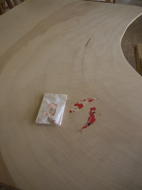 玉里の大改修現場がやっと完成の見込みが立ちました。この杢創舎日記で1年前にトラックを何台も連ねてお客様がご自身で製材手配された木材を運んでいるところをご紹介させていただのが工事のスタートでした。仮設の台所を設けての生活だったので、長きに渡って、ご不便をおかけしてしまいました・・・・写真のテーブルは虫穴などのために痛んだ部分に埋木をしてデザインを付けたものです。イメージは、屋敷内の池で泳ぐ錦鯉でとの事でした。この赤い色は朱漆に混ぜて使う顔料の弁柄や辰砂の取り置きのものを使って木染したとの事です。黒い部分は木炭だそうです。自社にこうした技術を持ち合わせている職人が居ることを誇りに思います。