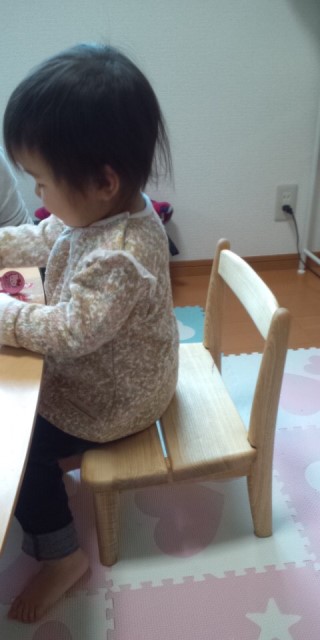 おはようございます!以前、子供椅子を購入してもらいましたお客様からいただいた写真です。とてもかわいらしくて癒されますね!名前はよしのちゃんです。2歳の女の子です。ご両親が椅子を使うと取り返しにくると言っていました。そういう行動から愛着をもって使っていただけるのは、とてもうれしいです。子供椅子ですが、大人が座っても全然大丈夫です!いい写真をもらいました!ありがとうございます。(大和田)