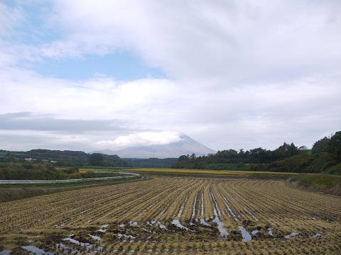 車中から瞬間撮影した稲刈りを終えた田圃と岩手山です。
