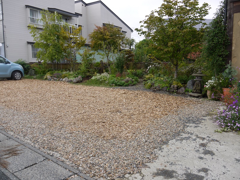 当社提供のウッドチップを駐車場に敷き込んだとの連絡をいただいて、見て来ました。この様な雰囲気でとてもいい感じだと思います。製材の背板が沢山出て来るので、今後もご用命があるなら、量産してみたいと思っていました。