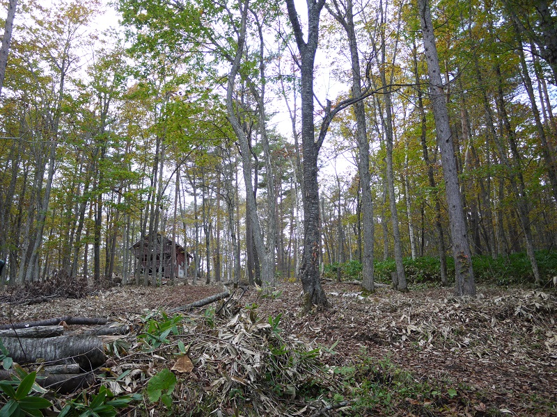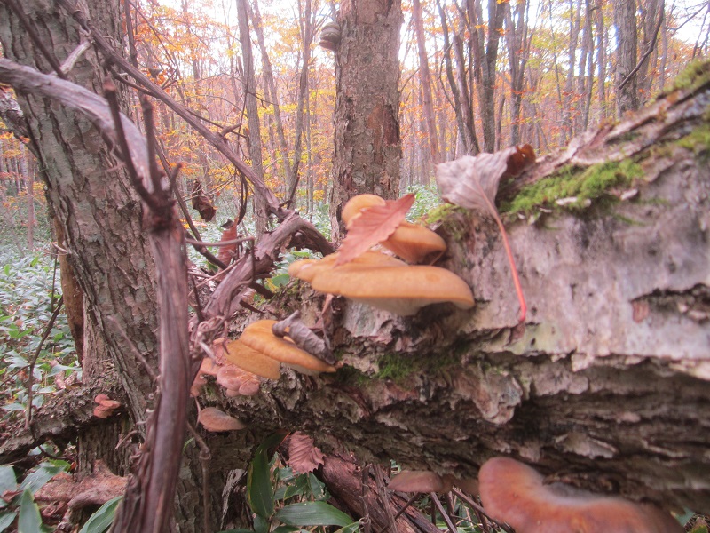 当社所有の岩洞の別荘の姿が露わになってきました。これまでは、周囲の笹の刈り祓いも出来ずに傾いていた建物もそのまま放置していましたが、そうと知った有志の方々が名乗り出て、ここまで綺麗にしてくれたのです。勿論その分の使用権が出てくるわけですが、当方としては、とても有難く感謝しています。難点は水が無い事なのですが、可能ならば近場から沢水を引き込めればと探索中です。そうすると、倒木にムキダケを発見!山の恵みに囲まれた素晴らしいところです。ただ・・・クマの糞も発見にて、気を付けましょう・・・・・汗・・・