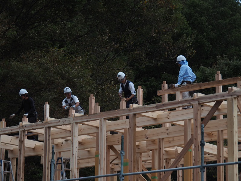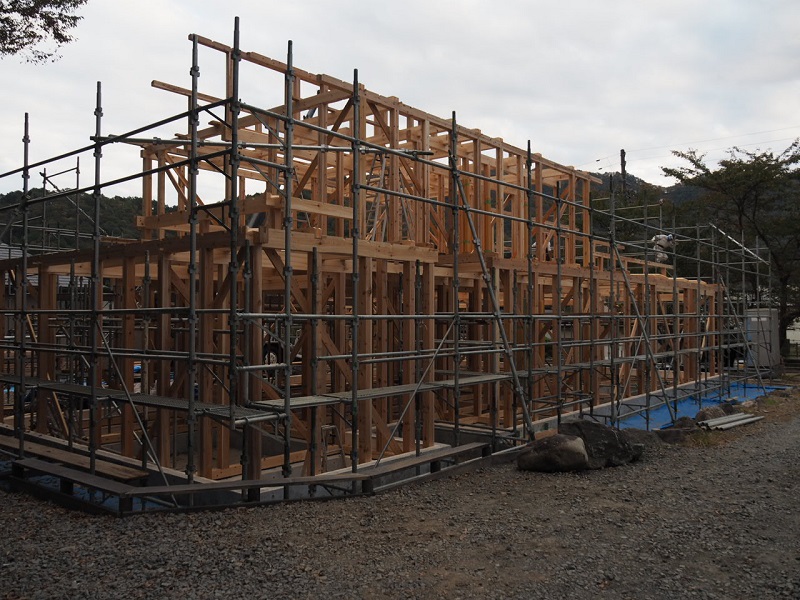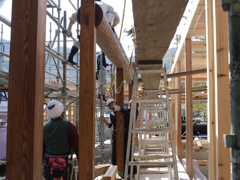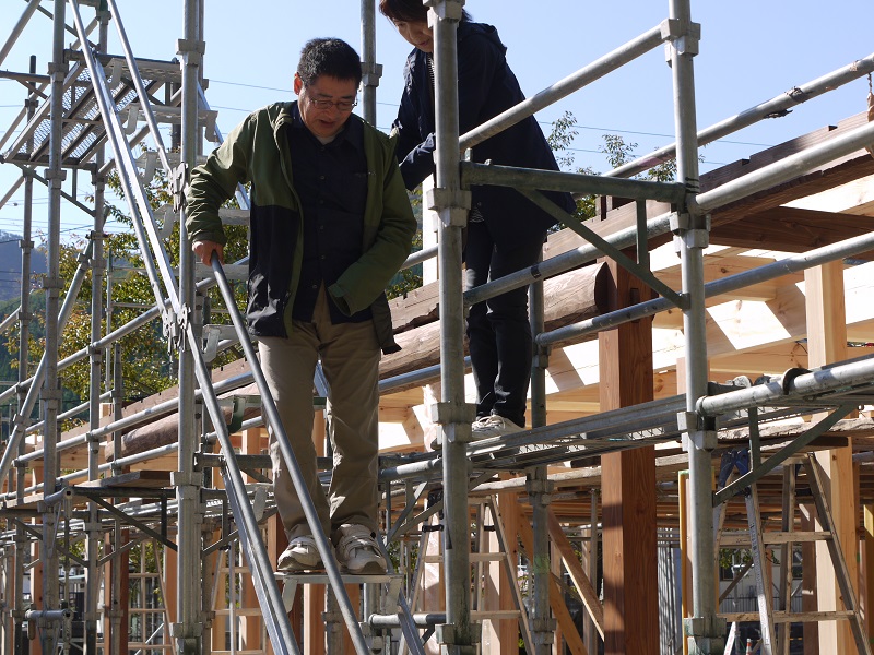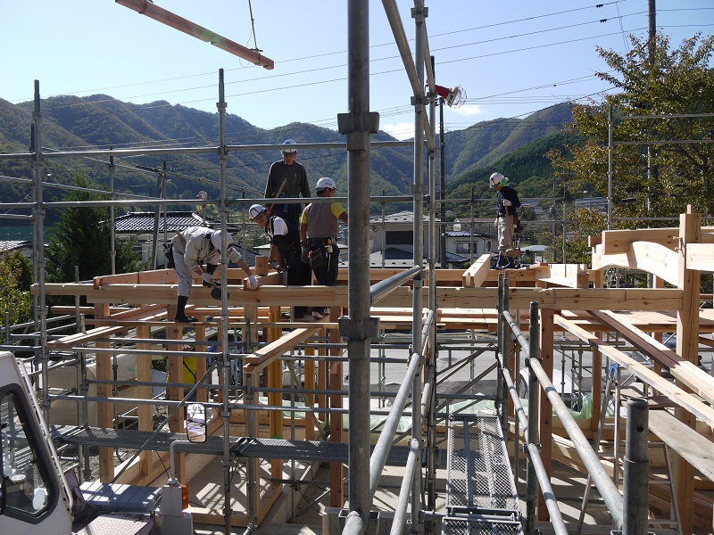 昨日は、釜石の新築工事の建て方を見て来ました。こうして、足場にも上がり、直接この目で見てきました。見事な構造躯体と生き生きと働く大工の皆の目の輝きに感動し、働きやすい足場を組んで準備してくれた先発隊の気持ちに感謝してきたのです。建て方に参加している20代の若手大工はこの木組みを刻んだ面々です。大きな間違いなく確りと組み込まれていました。そして、多少なりの困る場面があっても、先輩大工がささっと直して行くその速度が素早くて見事であり、その仕事ぶりを一緒に働いて見て学ぶ事が出来ているのも窺えて、感激一入でした。