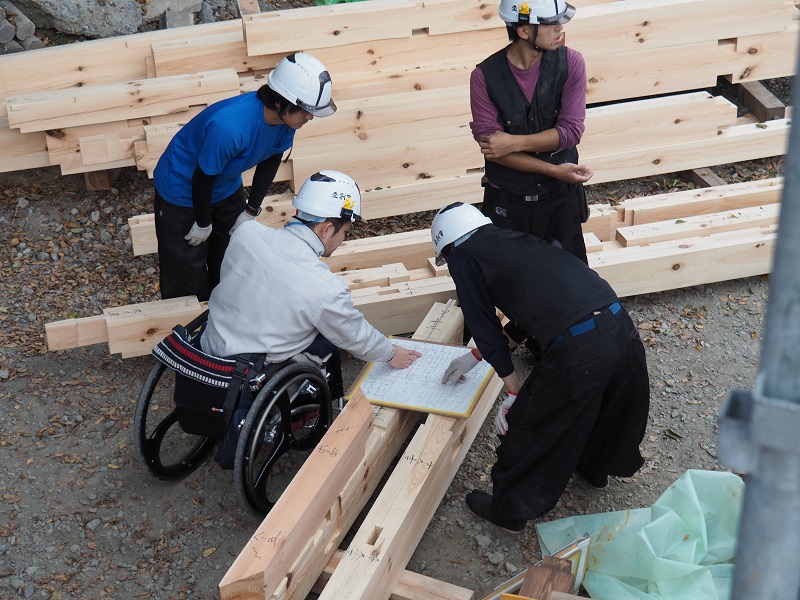 ここ数日、非常に良い天候に恵まれて、釜石の建て方は昨日無事上棟しました。墨付けした車椅子大工の大和田も建て方に立ち合い、自ら書いた伏図を後輩大工の面々に説明しながら、実際の木組みを確認できたのは嬉しかったと思います。いつかまた車椅子から立ち上がり、皆と共に働ける日を私は祈りたいと思います。