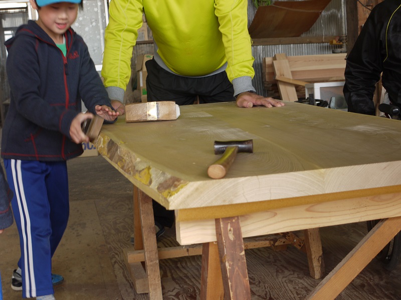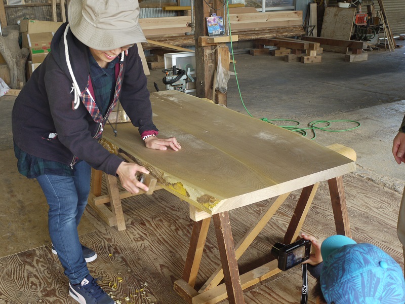 木のお店をオープンしておりますが、ご家族皆様でのテーブル造りをご希望されるお客様がいらしてくださいました。まずは、テーブル板をお選びいただき、面のところて表面の仕上げから取り組んで次は足造です。当方で、道具をお貸しして、施工方法の説明もしています。とても楽しそうで、ほほえましいですね。