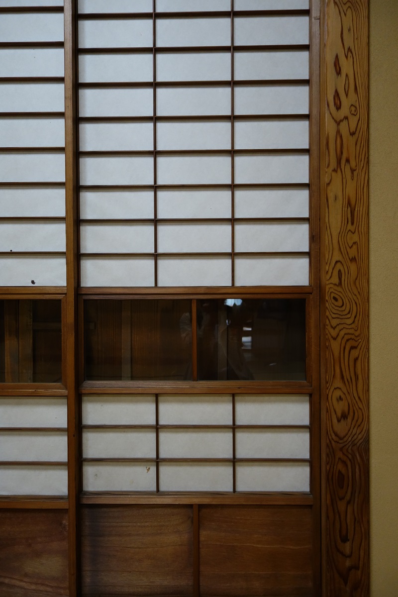 旧朝倉家住宅には、杉の杢目を上手に扱った杉の間があります。年輪の詰んだ杉の板目にはとても味わいがあるものが多く、柾目のみならずとも目を向けたくなります。