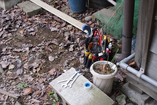 昨日の現場便りでは、オイルタンクの移動場面をご紹介しましたが、その際に、オイル配管を一度取り外して移動したのです。そして、また取り付ける段になって、ネジ部の締め込みに止水シールが必要だったのですが、何故か田村部長の道具箱(腰袋)から必要なシールや道具が次から次に出てくるのです。まるでドラエモンの「何でもポケット」の様みたいにその場で必要なものが見つかるのでありました。私たち建築屋にとっての道具類は必要不可欠なものですから、日々の道具箱の点検が、色々な工事の役に立つものです。小さなビスを入れた箱などもまるで玉手箱となる瞬間もあるものです。リフォームでの水道工事用の工具や備品も、とても役に立ちます。職人ならずとも、現場監督の工具箱にあってもそうありたいものなのです。私の工具箱もそうだったので、魔法の人であった頃が懐かしく、少々悔しくも「まるで、ドラエモンの様だねー」と笑いあいました。