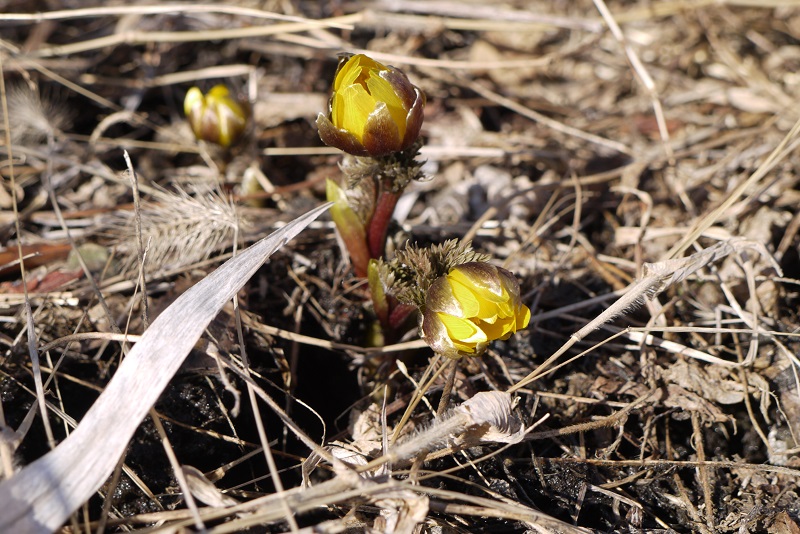 暑さ寒さも彼岸までと言いますが、その言葉通りの天気になって今週一週間のスタートです。福寿草ももう間もなく咲きそうというところ。この暖かさで一気に開花するのではないかという勢いです。いつも間にか蕾が3つになっていました。ハリギリの方はというと、うーんまだまだ固そうな蕾。その時をじっとこらえて待っているようにも見えます。まだまだ好摩の朝は冷え込むので霜柱もできるのですが、そろそろ姿を消してしまいそうです。(栗城)