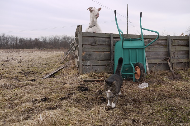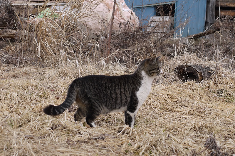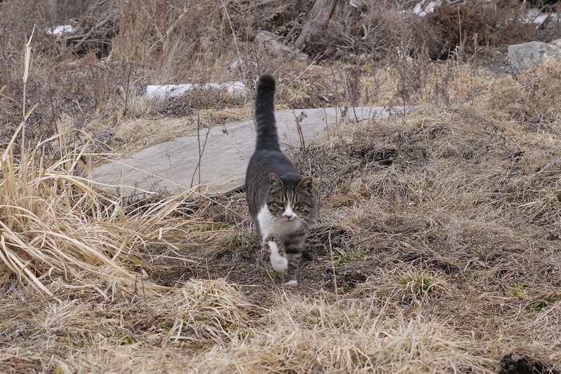 今朝は厚めの雲の間から青空は見えませんでした。ただし、今日の最高気温の予想は14度。暖かい日になりそうです。さて、写真を撮りに外へ出たところ、猫のタイガもついていくと一緒に事務所を出て、終始足にまとわりついていました。少し離れたところから様子を見ていると、足を止めて耳をすませたり、雪どけで見えてきた地表の穴を覗き込んだりしていました。人にはわからない野生の勘で何かを感じ取っているようです。ヤギたちとも朝の挨拶をするタイガでした。(栗城)