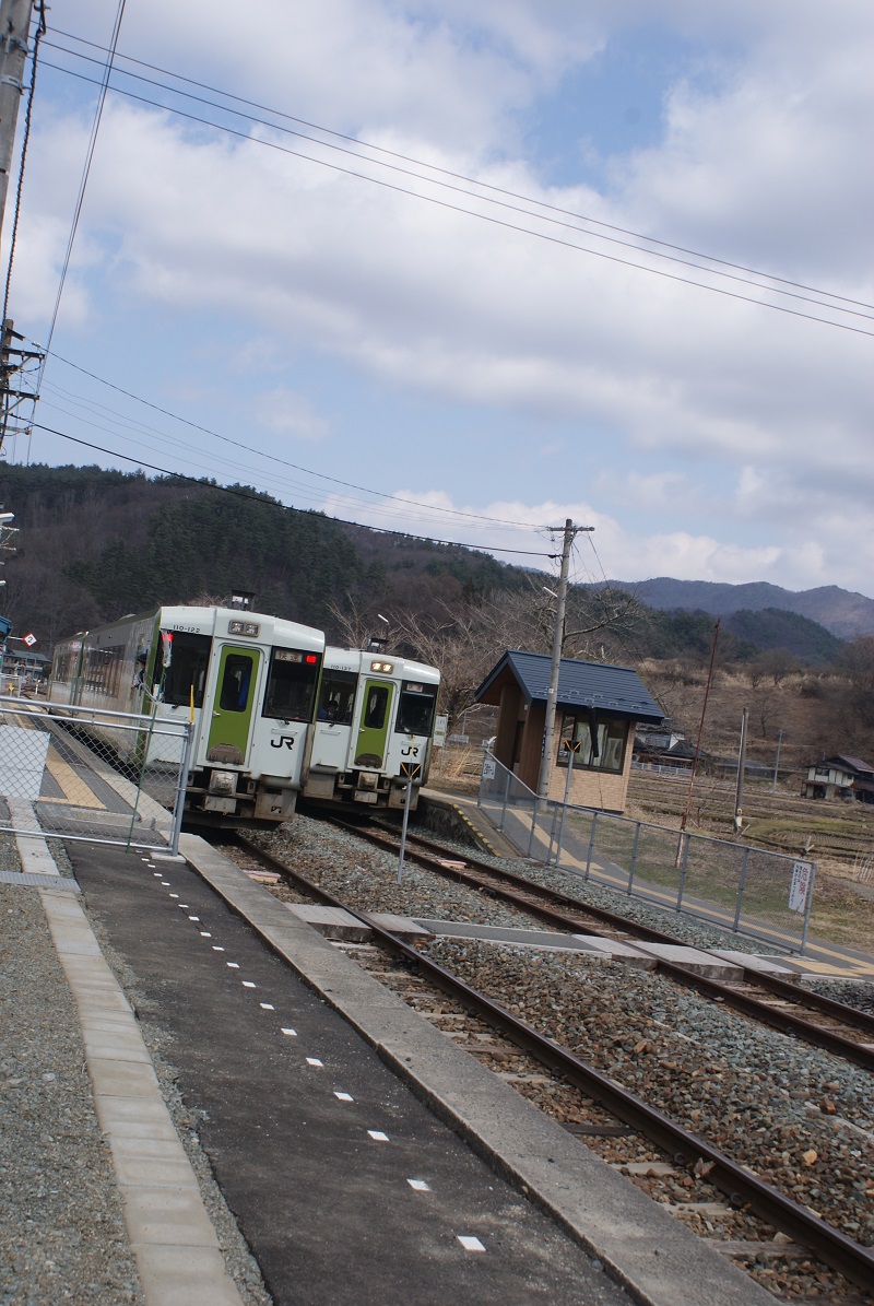 今年も中津川上流の山の木を購入するので、今朝は若手大工の面々を引き連れて、伐採現場の見学に行ってきました。春の気配が充満する山からの雪解け水は勢いよく、うねる山道を怖い思いしながら向かって来ました。待ち合わせ場所は、上米内駅でしたが、無人駅にて皆楽しそうにあっちこち見てたようでした。偶然列車もやって来てのすれ違い待ちしてたようです。