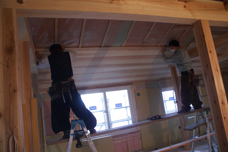 さて、現場作業の方はというと、3年目の先輩大工が今年入社の新卒大工を適切に指導しながら斜め天井の板張りをしていたのです。この頼もしさに感動し、喜ばしく感じました。若手の成長著しい姿は、杢創舎の未来展望の明るい兆しでもあると感じて現場を後にしたのでした。