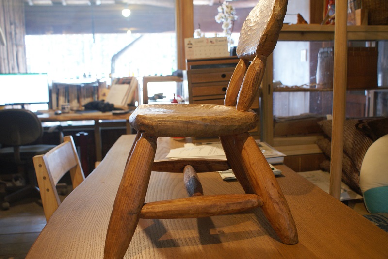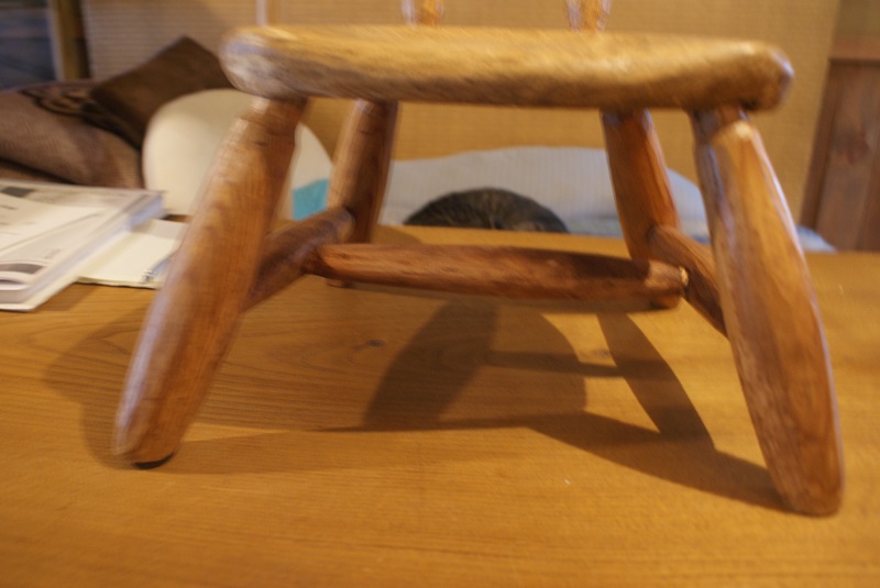 お客様が20年前に貰った木の椅子が壊れたとの事で、修理させて頂きました。椅子の足の支え(写真の↑印の所)を付け直して元通りに修理出来ました。そうした事が出来るのと、20年の経年変化でこの様な味が出るのも無垢の木で作る楽しさ良さだと思います。