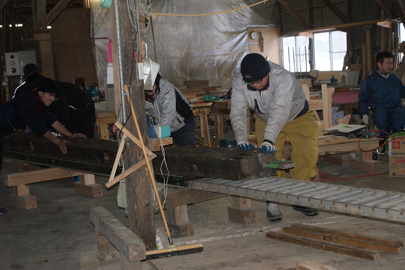入社式後の新人の初仕事は、古材の搬入でした。大きく重い材料を運ぶにはこつが必要です。先輩大工が移動用のローラーを準備しその上をて押し送り、馬と呼ぶ台を先を考えたところに置いて高さ調整しながら、その場で180度回転させながら運ぶ向きを調整して、梁材の下に手掛け用の受け木を流してから一気に人力で持ち上げるそうした一連の動きを大勢で学びました。これだと、むやみに力比べをする必要が無いので、体に大きな負担がかかりません。この様に物理の原理を予測考慮した仕事が尊いものです。F=maが力と速度のベクトル、「運動の方程式」だとすれば、加算されるのが経験という時間軸による四次元方程式へと変換していくのが職人力です。