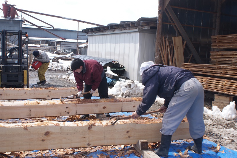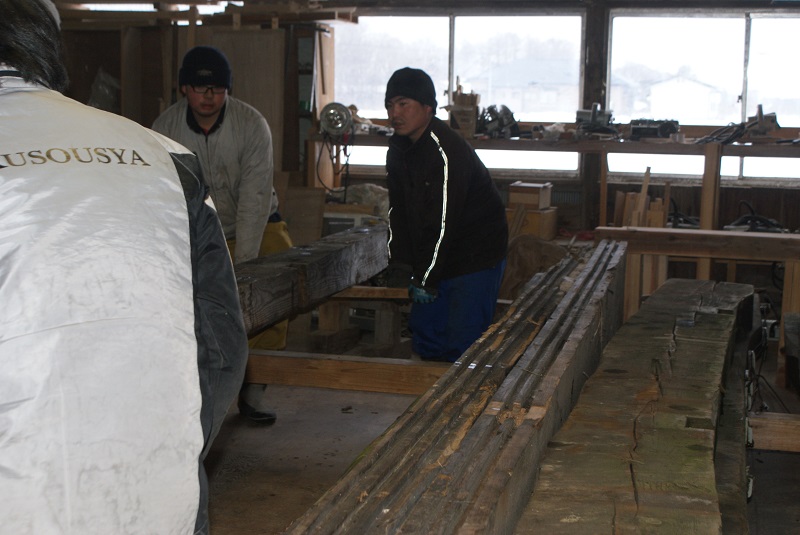 当社の製材機がフル稼働しています。受け手は人力なので、相当に手間が掛かります。だとしても、柱や梁を1本頼んでも当然それしか届きませんが、丸太で購入すると、柱や梁の他に、板材が手に入りますから、家造りには欠かせない造作材が揃うのです。まして、大工が傍にいるので、木の扱いを相談しながらの製材も可能ですから都合よい製材が出来るので有効活用できます。100年盛岡の町を水害から守ってくれた赤松なので、きちんと扱って、当社の家が今後100年以上をもそこに住む皆様を守り続けて行くものと信じています。その為にも、今後は全棟構造計算をして行く所存です。
