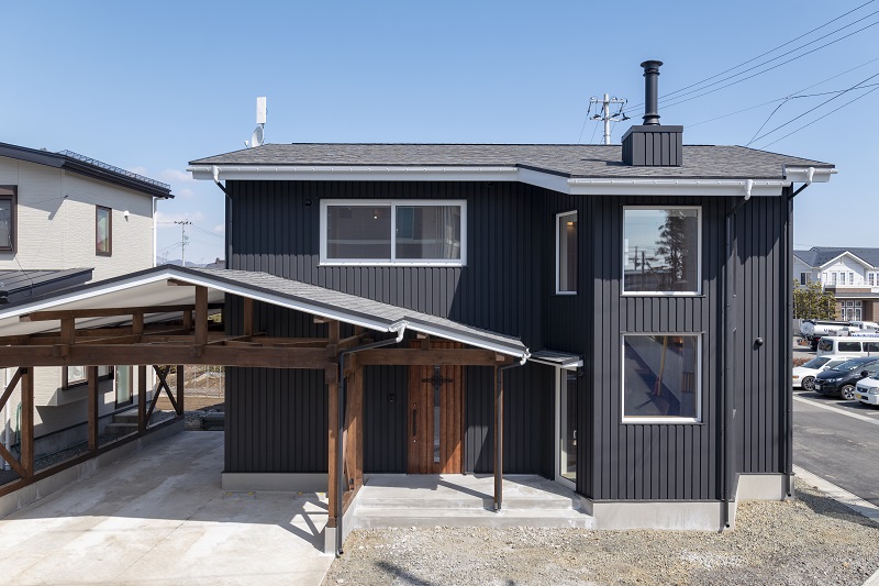 車庫から雨雪に困らずに玄関に入れるインナーガレージの外観です。その車庫で薪を乾かして、薪ストーブの所に薪を運び込めるようにも計画されていました。