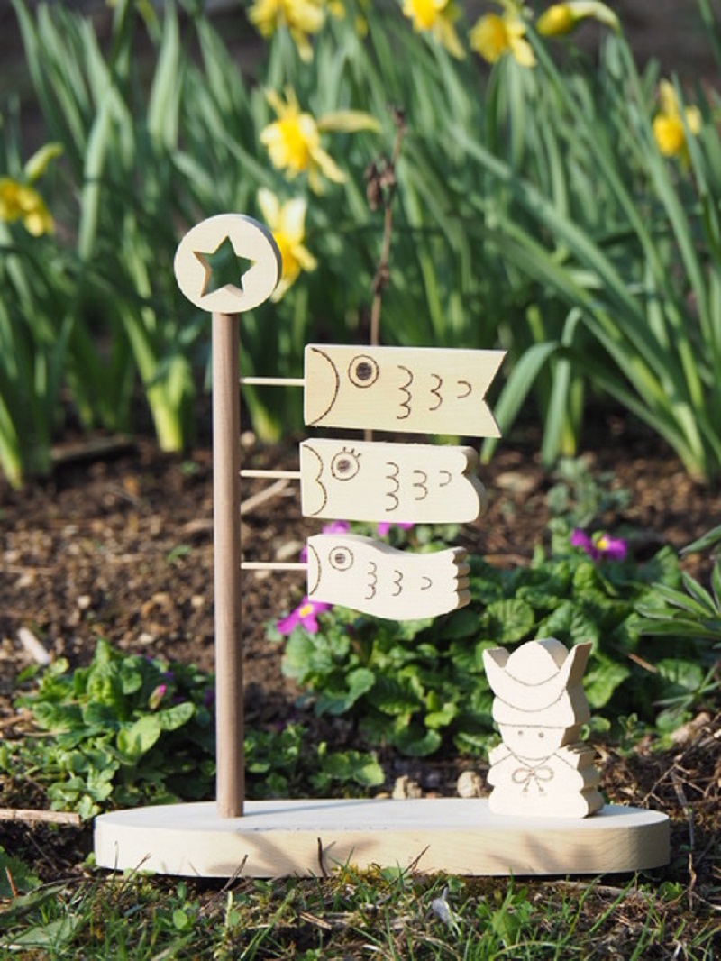 初の9連休も既に半ばです。小学生の頃の夏休みが過ぎて行くあの不思議な心残りを感じるのと同じ気持ちを感じてしまいす。連休初日の28日は誰も居ない筈の作業場から、機械音が聞こえて「風山大工がやっているな」と思ったのは、娘の愛理ちゃんが最近胸を隠す姿をすると、髪のない頭に鉢巻撒いてちょび髭顔で実際にその恰好をしたときは吹き出してしまいました。でもまぁ個室を一部屋作ってあげたいとの気持ちは理解できて、材料を提供してあげたのです。たぶんその加工に来ていると閃いての事でしたが、犬の散歩中の専務から携帯電話で「風山さんが来てるよ」との連絡に「わかってるよー」と受け答えして、場内に向かうと見慣れた柳村の車も居て、声を掛けると、孫の鯉のぼりを作るとの事でありました。翌日糸鋸を使い造った作品がメールで届いたのがこの写真です。