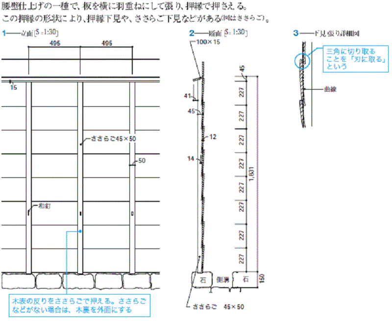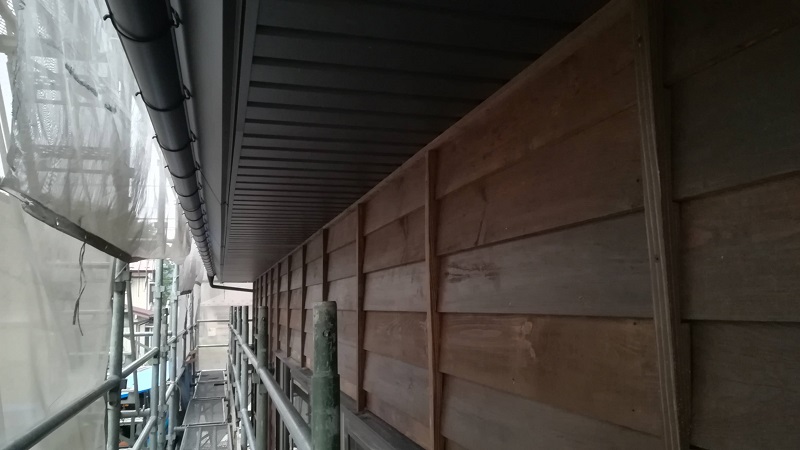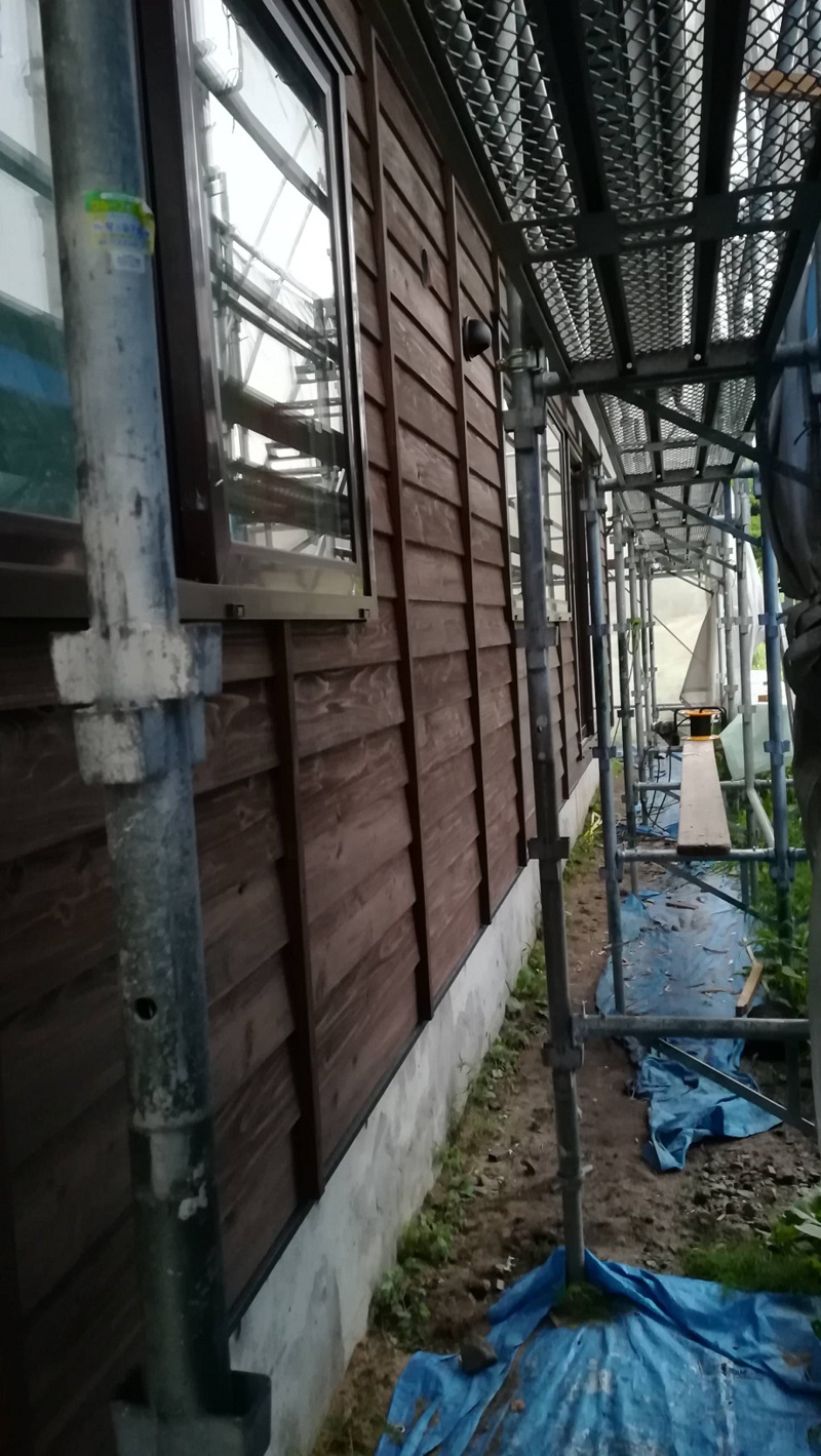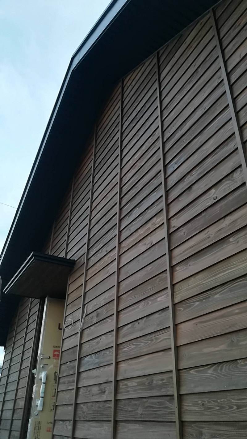 先日は、建具職のささらご造りと塗装職の仕事に関して書かせて頂きましたが、昨日川口の新築現場で外壁板を張り込んだ上にそのささらごの取り付けも行われました。この下見板張り工事の初体験した若手大工に聞くと、場所によって板の厚さに違いがあるので、個所ごとに鋸をいれて直しながら張るのが大変だったとの事です。木だから大変なのか、木だから直して取り付けが出来るものだと考えるかがポントです。工場生産品ではとても出来ない事を無垢の木が大工にこうした体験を与えてくれるのです。そして、一度外した板を再生手直し塗装して、再度この様に使う事が出来て表情も豊かになります。当社の塗装職人は、「新しい板よりも耐久性があると思う」と言います。ささらごのスパンは一般的に455mm間隔ですが、今回909mm間隔にしてあります。スッキリして、結構いい感じに見えます。