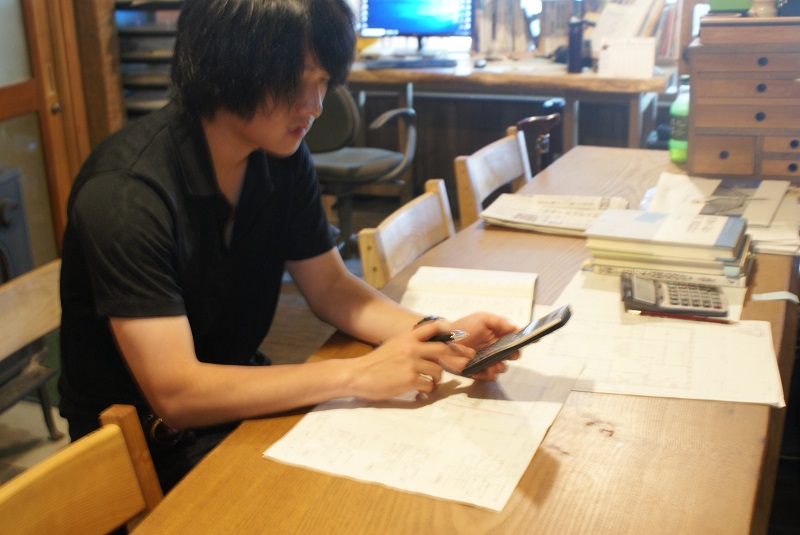 大工の高橋が、現場監督見習中です。まずは、基礎断面の算定計算を学びました。基礎は建物を支えて、地震時にも壊れない丈夫な構造であることが大切ですから、現場監督は、人の手配や材料の手配段取りだけではなく、自分が管理する構造躯体がどの様に設計されているかを学び、それが現場でどう造られるかを覚えてこその管理者になれるのだと私は思います。まずは、建物総重量を算出して、その重さを支える地盤の地耐力の安全性を計算しました。そうすると基礎にはそれによる地反力が基礎断面に作用することが分かります。そして、どの様な形で力がかかるかを調べて、曲げモーメントやせん断力の公式マニアルから計算方法を調べ、基礎断面に作用する応力が導き出せます。それが計算できると、予定した断面形状が正しいのかと、必要な配筋断面と本数を算出出来ます。これを地道に取り組んで、頭に叩き込むと、現場管理に行ったときに、配筋している職人の手元を見ながら、何故ここに13ミリの鉄筋が2本必要なのかを、図面に書いてあるからだけでなく、物理的理由で理解管理指導できるのです。私も、教え甲斐があり、嬉しくなります。老体と左半身麻痺の体にムチ打ちより一層頑張らねばと思います。